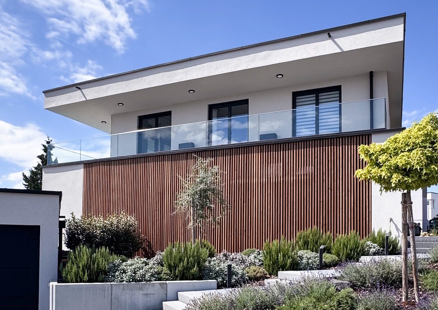 Moderne Hausfassade mit vertikaler Holzlamellenverkleidung, Glasbalkon und klarer Flachdacharchitektur.